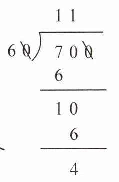 从竖式中可以看出,$70÷6$商$1$,$1$在十位上,表示$1$个十,即$10$,$6×10 = 60$,$70 - 60 = 10$;再把个位上的$0$落下来,$100÷60$商$1$,$1$在个位上,表示$1$个一,即$1$,$60×1 = 60$,$100 - 60 = 40$。