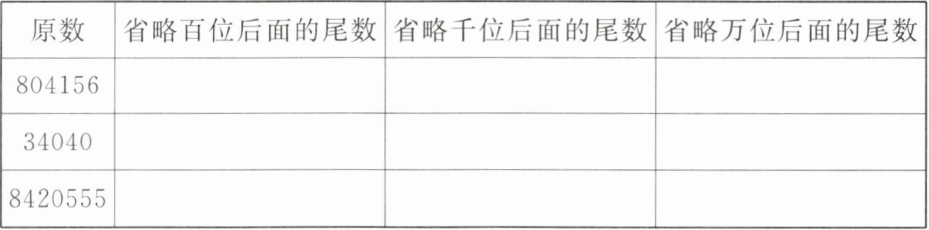 | 原数 | 省略百位后面的尾数 | 省略千位后面的尾数 | 省略万位后面的尾数 |