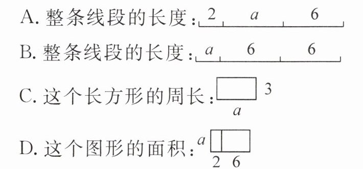 选项D:长方形的面积等于长$×$宽,已知长方形的长是$a$,宽是$2$,则面积为$a×2 = 2a$,不能用$2a + 6$表示,所以该选项错误。