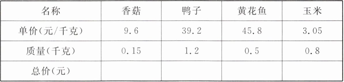 解析:题目考查小数乘法的实际应用,涉及到单价、质量和总价之间的关系,即$总价 = 单价×质量$,通过这个公式分别计算出每种物品的总价并填入表格。
