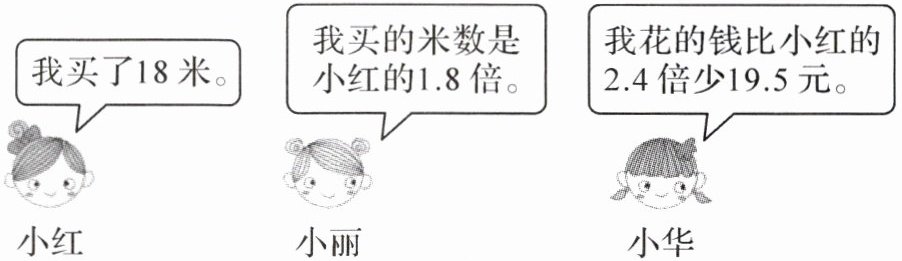 小丽:小丽买的米数是小红的$1.8$倍,先求出小丽买的米数,再根据“总价 = 单价×数量”计算小丽花的钱数。
