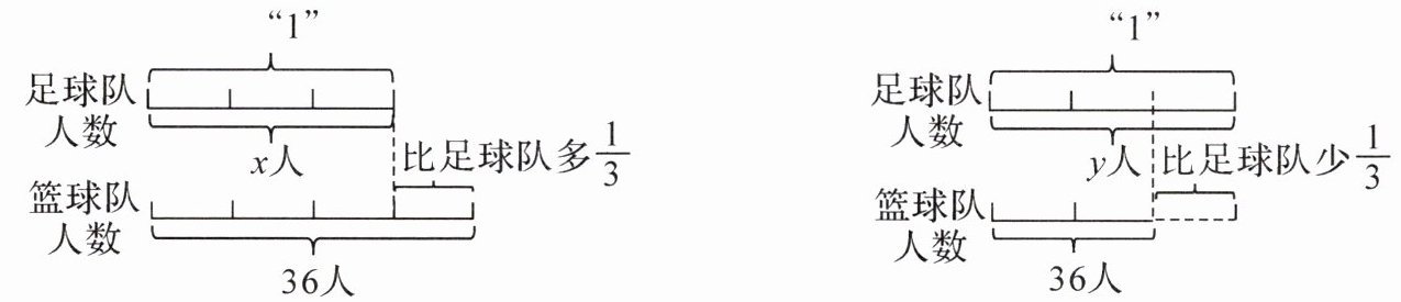 足球队人数 - 足球队人数的$\frac{1}{3}$ = 篮球队人数;$y-\frac{1}{3}y=36$。