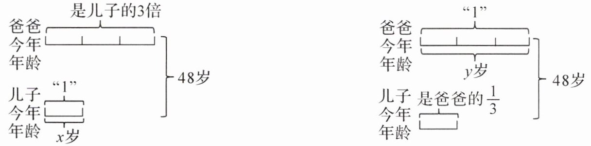 等量关系:爸爸今年年龄 = 儿子今年年龄×3,儿子今年年龄+爸爸今年年龄 = 48岁。