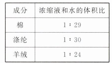 3. 用某种浓缩型洗衣液洗衣服,需根据不同的衣服成分配制出不同浓度的稀释液(如表)。现在需要3200 mL的稀释液浸泡一件羊绒衫,需要多少浓缩液?