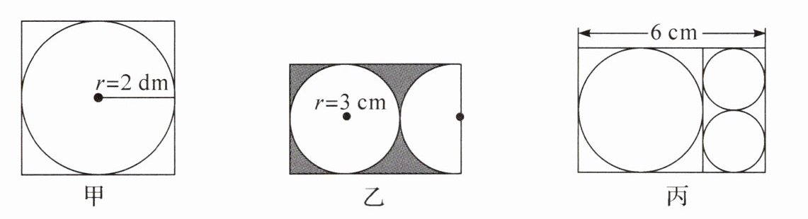 (3)如图丙,长方形的纸剪出两个相同的圆后,剩下部分正好是个正方形。原来长方形的面积是(