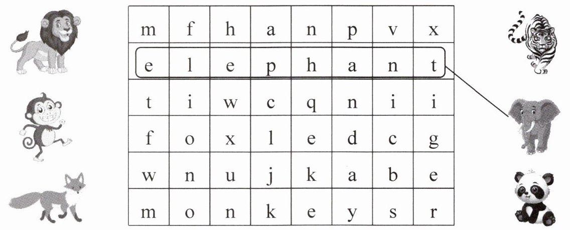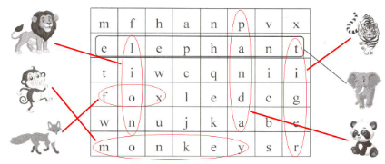 【解析】:本题主要考查单词拼写及对常见动物英文单词的认知。解题的关键在于从给定的字母矩阵中找出表示动物的英文单词,并与对应的动物图片进行连线。需要熟悉常见动物的英文表达,