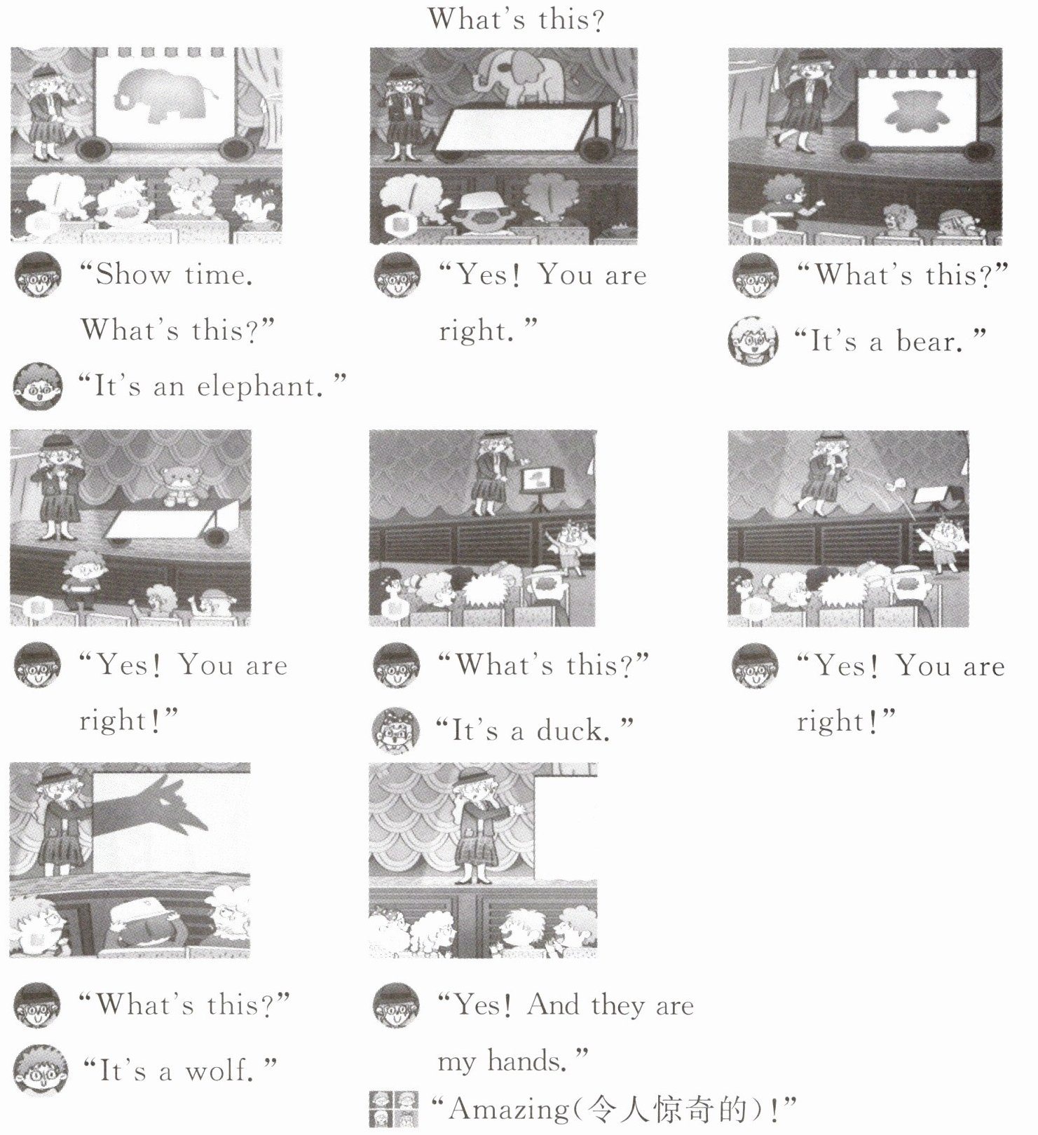 读一读。影子游戏里提及了哪些动物?请在相应括号里打钩。