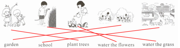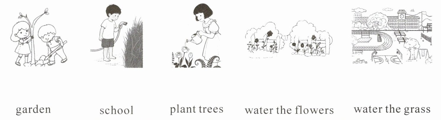 “plant trees”意思是“植树”,对应有人拿着工具种树的图片;