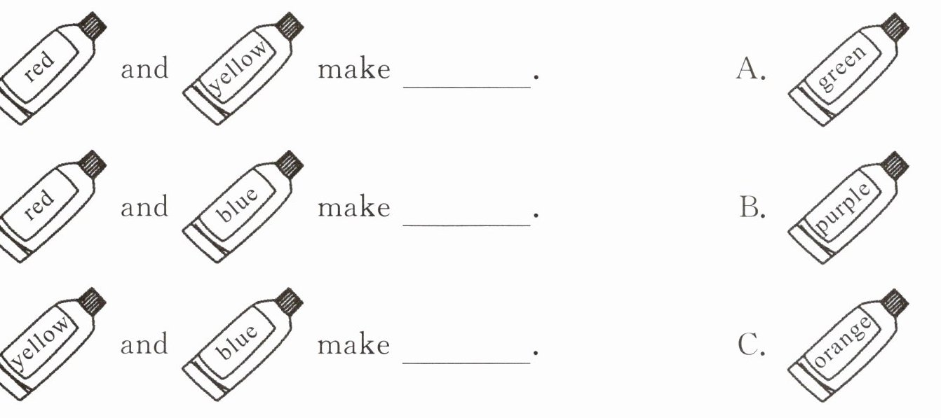 分别填写“red”,“blue”,“purple”。(答案不唯一,其他合理的颜色搭配也可以,如“yellow and blue make green.”等。)