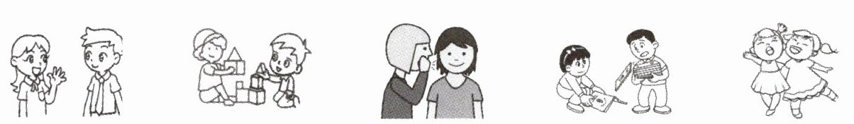【解析】:本题可根据图片内容,结合所给选项的英文表述来进行选择。图片从左到右依次展示了打招呼、一起玩耍、友好交流、互相帮助、友好相处等场景,需要从选项中找出与这些场景对应的英文表达。