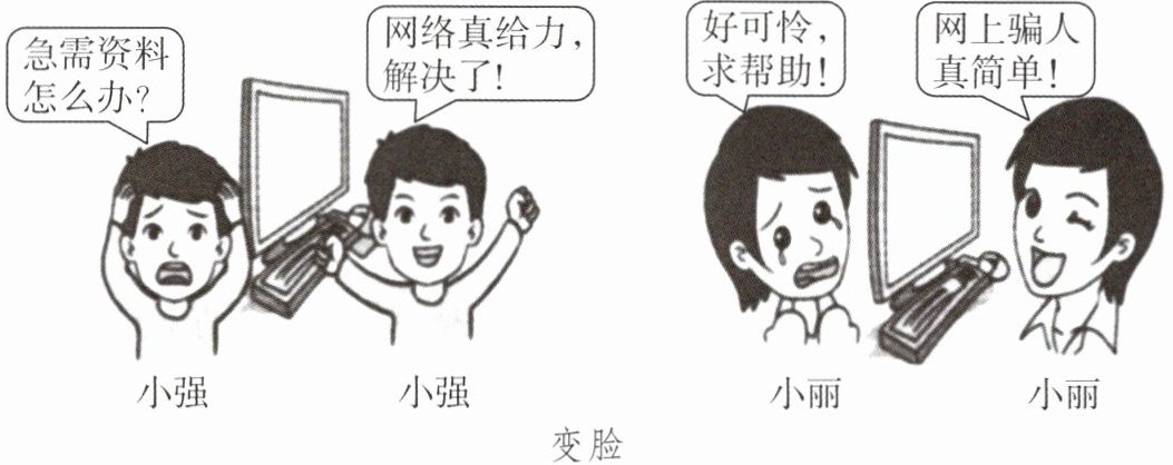 消极影响:网络信息良莠不齐。在网络时代,人人能够参与信息发布,信息变得丰富的同时,也出现了一些虚假的、不良的信息。如漫画中小丽遭遇网上骗人,说明网络存在一些欺诈等不良信息。