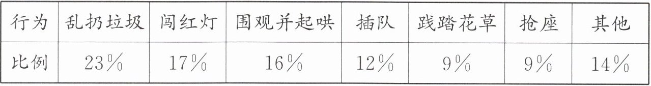 (1)本题主要考查对社会规则的认识和理解。从调查结果中可以看出,乱扔垃圾、闯红灯、围观并起哄、插队、践踏花草、抢座等行为,都是违反社会规则的表现。这些行为违反了道德和法律两种社会规则。
