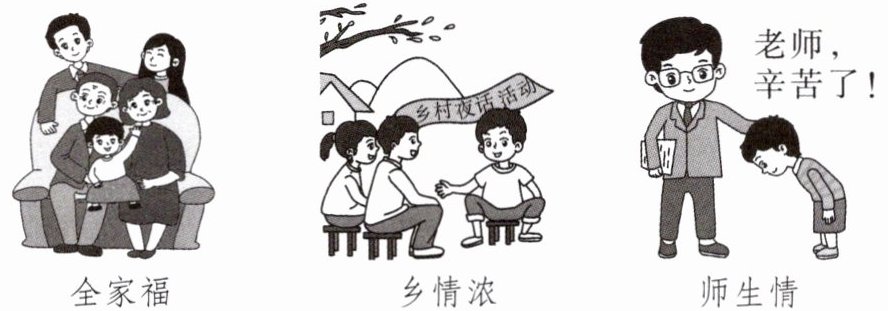 第一幅图“全家福”体现的是家庭成员之间的关系,属于血缘关系;第二幅图“乡村夜话活动”体现的是同乡之间的关系,属于地缘关系;第三幅图“师生情”体现的是老师和学生之间的关系,属于业缘关系。