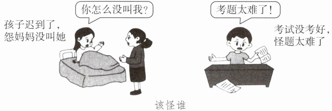 漫画中孩子迟到怨妈妈没叫她,考试没考好怪题太难,这都是缺乏责任感的表现。在社会生活中,我们每个人都扮演着不同的角色,承担着不同的责任。只有对自己负责的人,才能使自己的潜能得到充分挖掘和发挥,才有资格、有能力、有信心承担起时代和国家所赋予的使命。所以每个人首先要对自己负责。