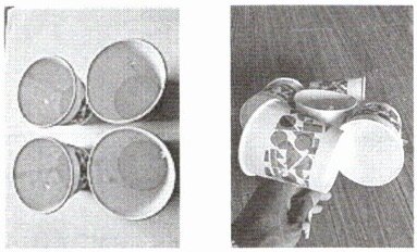 (3)用剪刀分别另外4个相同大小的纸杯杯身中间戳2个相对的孔,并将4个纸杯安装到吸管上。