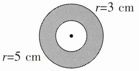 解析:本题主要考查圆的面积公式。圆的面积公式为$S = \pi r^{2}$($S$表示圆的面积,$r$表示圆的半径,$\pi$通常取$3.14$)。对于圆环,其面积等于外圆面积减去内圆面积,即$S_{环}=\pi R^{2}-\pi r^{2}$($R$为外圆半径,$r$为内圆半径)。