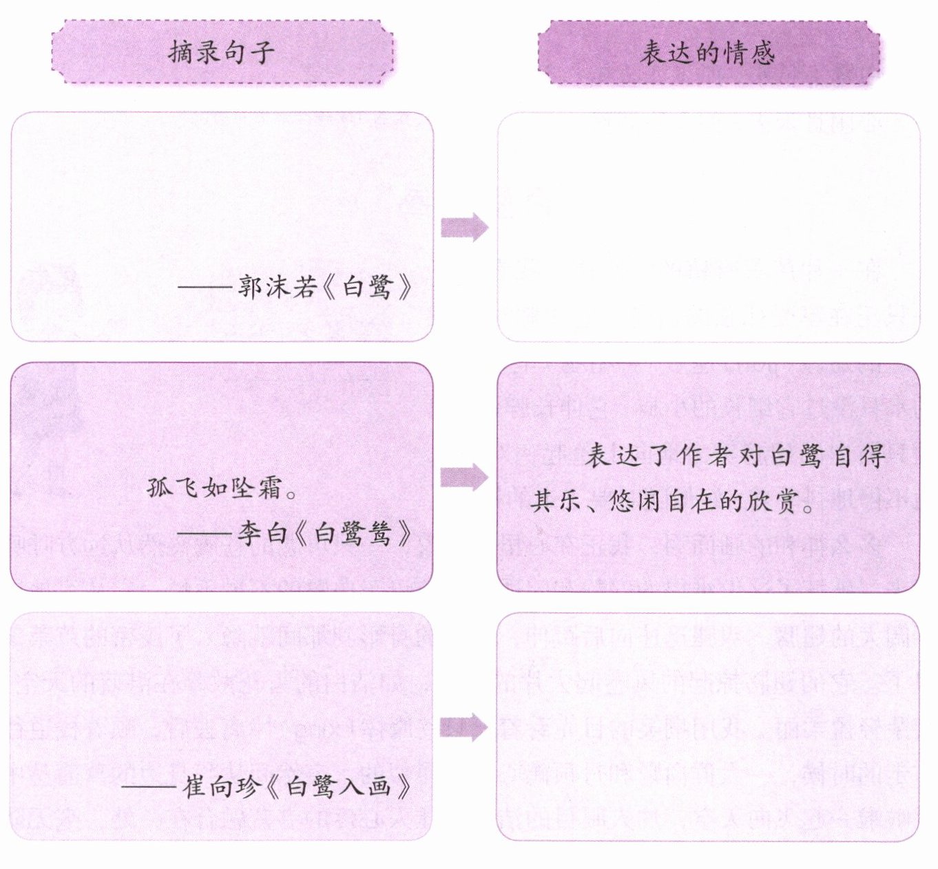 摘录《白鹭》《白鹭鸶》《白鹭入画》三篇文章中描写白鹭的句子,想一想,这些句子表达了作者怎样的情感?