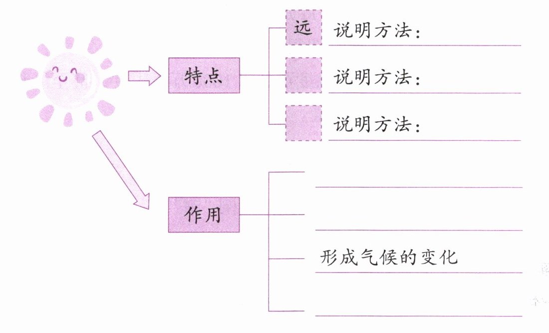 默读课文第1~3自然段,想一想:课文介绍了太阳的哪些特点,分别运用了哪些说明方法?填一填,选一选,完成思维导图。