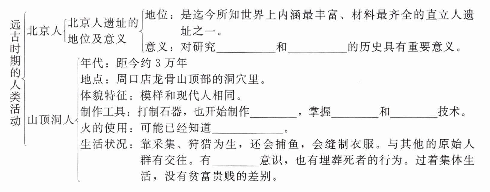 山顶洞人:年代:距今约3万年;地点:周口店龙骨山顶部的洞穴里。体貌特征:模样和现代人相同。制作工具:打制石器,也开始制作______,掌握______和______技术。火的使用:可能已经知道______。生活状况:靠采集、狩猎为生,还会捕鱼,会缝制衣服。与其他的原始人群有交往。有______意识,也有埋葬死者的行为。过着集体生活,没有贫富贵贱的差别。