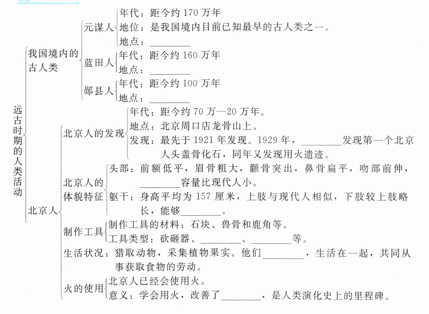 云南元谋 陕西蓝田 湖北郧阳 裴文中 脑 直立行走 尖状器 刮削器 结成群体 生存条件 人类起源 古人类演化 骨器 磨光 钻孔 人工取火 爱美