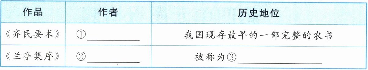 (1)统治者推行各项利于经济发展的政策;南方自然资源及地理条件的优越;社会环境相对安定;北人南迁。(2)措施:穿汉服、改汉姓、说汉话、与汉人贵族通婚、推行汉族的官制和律令。作用:改善和巩固了鲜卑拓跋部与汉人的关系,促进了民族交融。(3)①贾思勰 ②王羲之 ③“天下第一行书”。(4)人口大迁徙、江南地区经济的发展、北方民族大交融等。(任答两点即可)