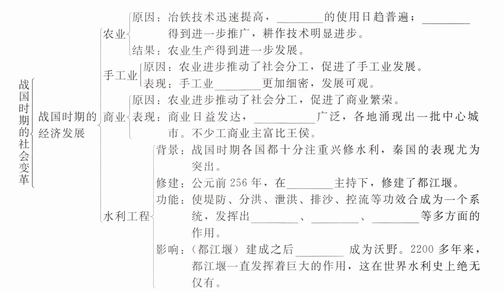 战国时期 齐 燕 魏 争霸 桂陵之战 秦 政治经济秩序 市场 县制 世袭特权 户籍 法度 土地 徭役 度量衡 军功 铁器 牛耕 分工 货币流通 李冰 防洪 灌溉 水运 成都平原
