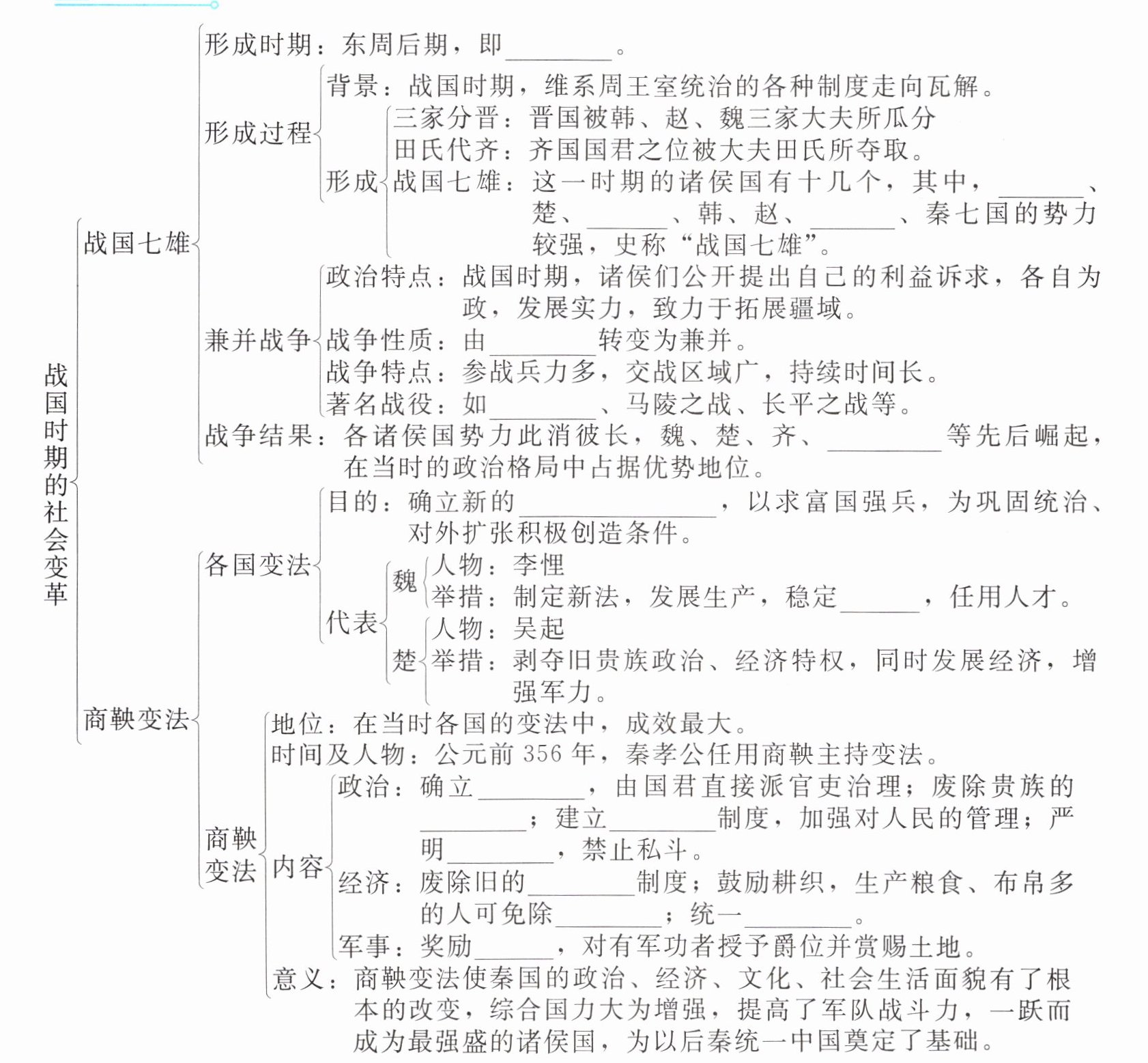 | | |形成战国七雄:这一时期的诸侯国有十几个,其中,______、楚、______、韩、赵、______、秦七国的势力较强,史称“战国七雄”。|