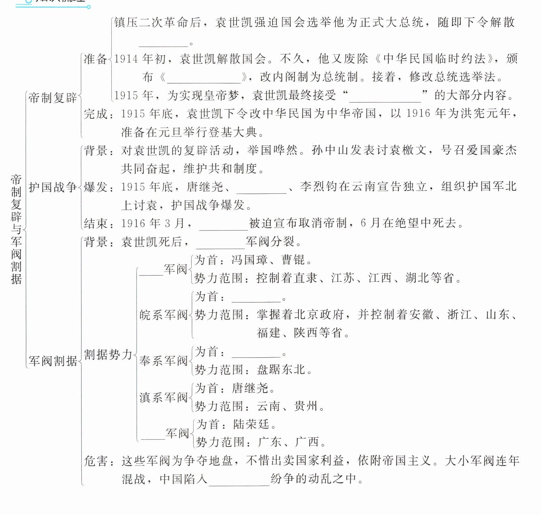 ”的大部分内容。|||完成|1915 年底,袁世凯下令改中华民国为中华帝国,以 1916 年为洪宪元年,准备在元旦举行登基大典。||护国战争|背景|对袁世凯的复辟活动,举国哗然。孙中山发表讨袁檄文,号召爱国豪杰共同奋起,维护共和制度。|||爆发|1915 年底,唐继尧、蔡锷