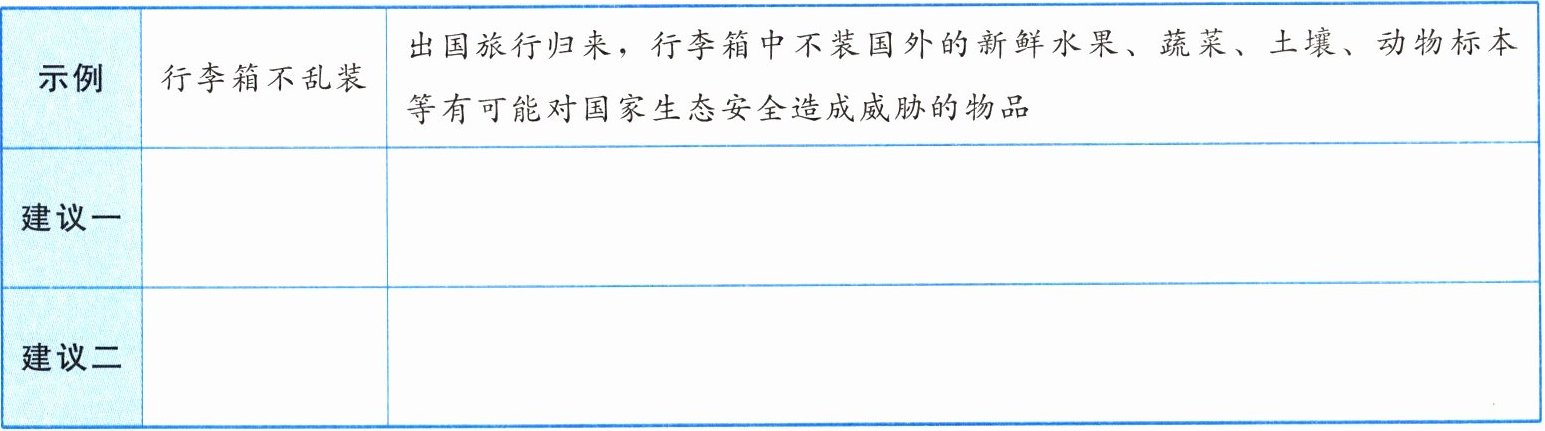 |示例|行李箱不乱装|出国旅行归来,行李箱中不装国外的新鲜水果、蔬菜、土壤、动物标本等有可能对国家生态安全造成威胁的物品|