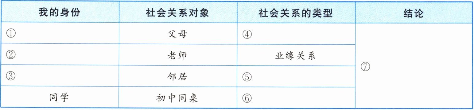 (1)①子女 ②学生 ③邻居 ④血缘关系 ⑤地缘关系 ⑥业缘关系 ⑦人的身份是在社会关系中确定的