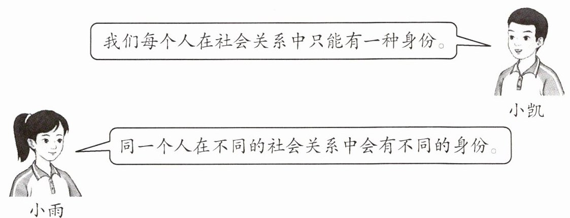 关于我们在社会关系中的身份,小凯同学和小雨同学发表了各自的观点。