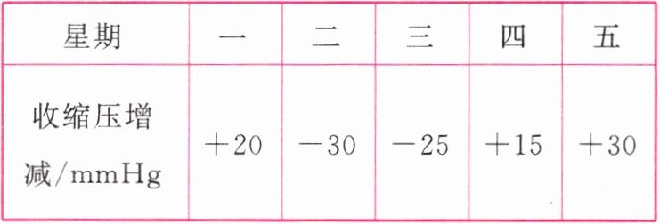 6. 【跨学科融合—生物】某病人每天下午需要测量血压,该病人上周日收缩压为120mmHg,下表是该病人这周每天与前一天相比较收缩压的变化情况,则本周星期五的收缩压是