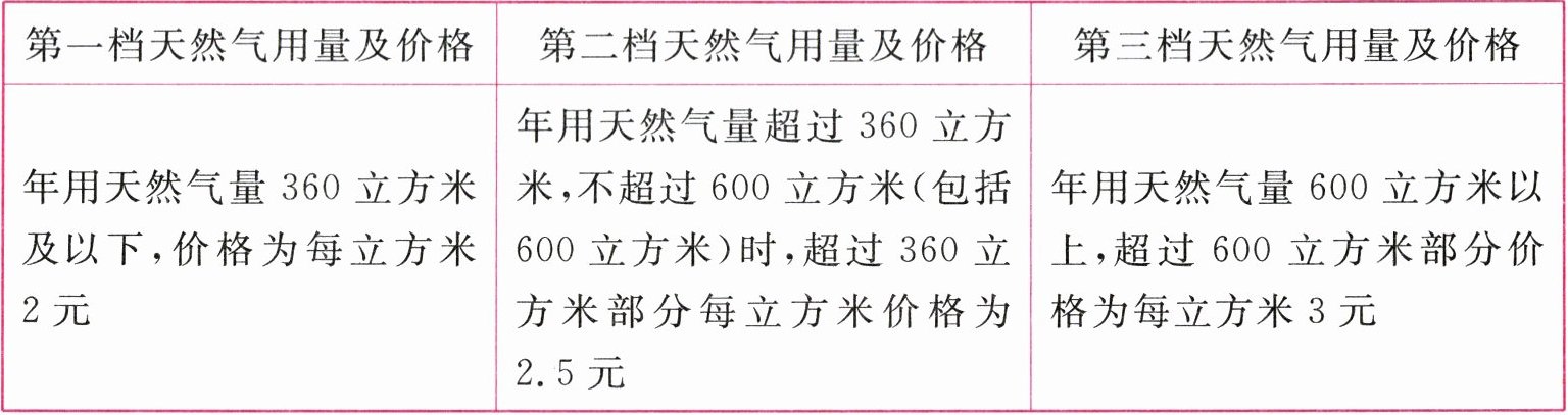 | 年用天然气量360立方米及以下,价格为每立方米2元 | 年用天然气量超过360立方米,不超过600立方米(包括600立方米)时,超过360立方米部分每立方米价格为2.5元 | 年用天然气量600立方米以上,超过600立方米部分价格为每立方米3元 |