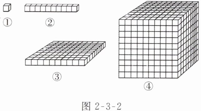 2. 如图 $2 - 3 - 2$ 所示,取一个小立方块作为基本单元(如图 $2 - 3 - 2$①),将 $10$ 个基本单元排成一个“长条”(如图 $2 - 3 - 2$②),再用 $10$ 个“长条”组成一个长方体(如图 $2 - 3 - 2$③),最后用 $10$ 个长方体构成一个正方体(如图 $2 - 3 - 2$④).