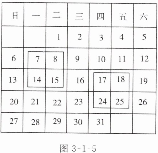2. 【推理问题】如图 3 - 1 - 5 是某月的月历,用一正方形在月历内任圈出 4 个数 $\begin{bmatrix}a & b \\ c & d\end{bmatrix} $,请用一个等式表示 $ a $,$ b $,$ c $,$ d $ 之间的关系.