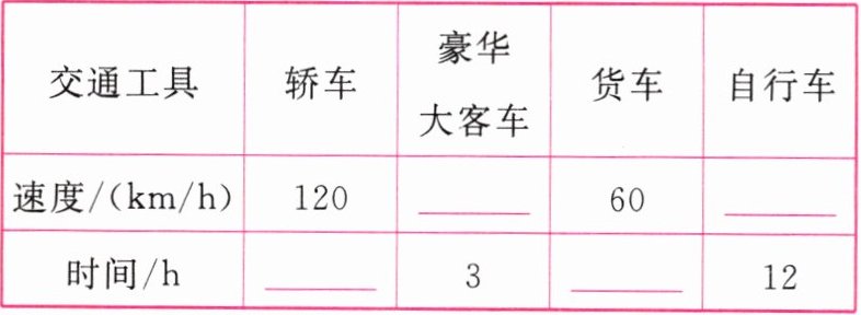 2.【应用意识】A,B两城相距$240km$,四种不同的交通工具从A城到B城的速度和所用的时间情况如下表.