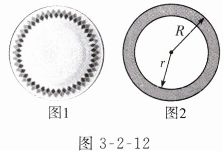 7. 【教材 P81 练习 3 变式】如图 3-2-12 所示的圆形盘子,外圆半径是 $ R \mathrm{cm} $,内圆半径是 $ r \mathrm{cm} $,现在要给盘子环形部分上釉(图 2 阴影部分),用代数式表示阴影部分的面积。当 $ R = 10.25 \mathrm{cm} $,$ r = 8.25 \mathrm{cm} $ 时,求阴影部分的面积($ \pi $ 取 3)。
