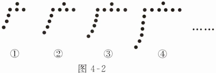 思路分析:图 4 - 2①由 $7$ 个棋子摆成,图 4 - 2②,③,④分别由 $9$ 个,$11$ 个,$13$ 个棋子摆成。$7 = 2×1 + 5$,$9 = 2×2 + 5$,$11 = 2×3 + 5$,$13 = 2×4 + 5$,由此可得第 $5$ 个“广”字由 $2×5 + 5 = 15$(个)棋子摆成,第 $n$ 个“广”字由 $2×n + 5 = (2n + 5)$(个)棋子摆成。