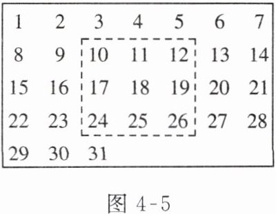 6. 如图 4 - 5 所示是某月份的月历,用正方形圈出 $9$ 个数,设最中间一个数是 $x$,则用 $x$ 表示这 $9$ 个数的和是