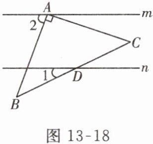 2. (宁波市)已知直线$m // n$,将一块含$45^{\circ}角的直角三角板ABC$按如图 13 - 18 方式放置,其中斜边$BC与直线n交于点D$。若$\angle 1 = 25^{\circ}$,则$\angle 2$的度数为( )