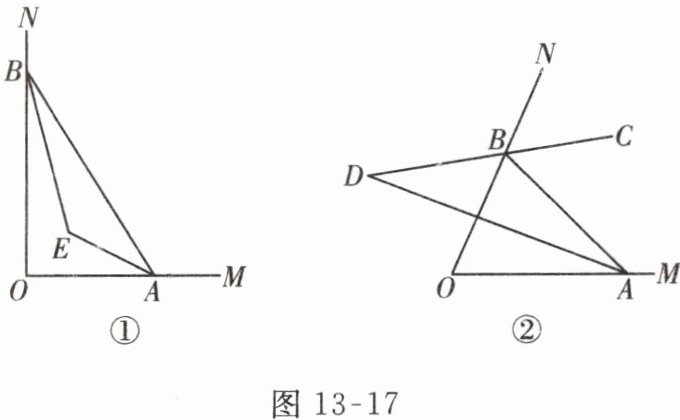 (1)如图 13 - 17①,$AE$,$BE分别是\angle BAO$,$\angle ABO$的平分线,随着点$A$,$B$的运动,求$\angle AEB$的度数。