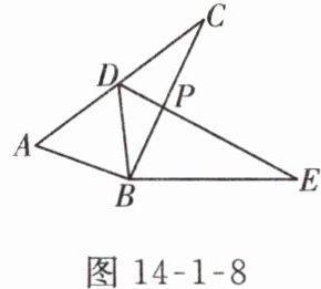 4. 如图 14 - 1 - 8,已知$\triangle ABC\cong\triangle DBE$,点$D在AC$上,$BC与DE交于点P$。