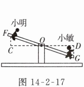 5. 如图14-2-17所示,小明与小敏玩跷跷板游戏。如果跷跷板的支点$O$(即跷跷板的中点)与地面的距离是50cm,当小敏从水平位置$CD$下降40cm时,小明这时离地面的高度是______cm。