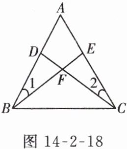 6. 如图14-2-18,在$\triangle ABC$中,已知$\angle 1= \angle 2$,$BE= CD$,$AB= 5$,$AE= 2$,则$CE= $______。