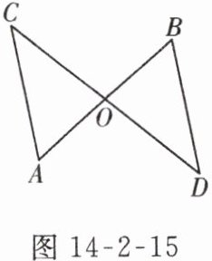 3. 如图14-2-15,$AB与CD相交于点O$,已知$\angle A= \angle B$,$AO= BO$,又因为$\angle AOC= $______,所以$\triangle AOC\cong\triangle BOD$,其判定依据是______。