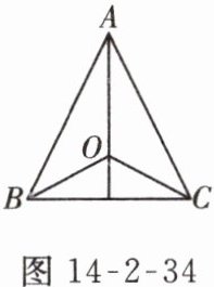 2. 如图 14 - 2 - 34,已知$AB = AC$,$BO = CO$,$\angle BAC = 50^{\circ}$,则$\angle CAO= $______。