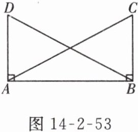 7. 如图 14 - 2 - 53,小明和小芳以相同的速度分别从点$A$,$B$同时出发,小明沿$AC$行走,小芳沿$BD$行走,并同时到达点$C$,$D$。若$CB\perp AB$,$DA\perp AB$,则$CB与DA$相等吗?为什么?