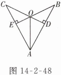 2. 如图 14 - 2 - 48,$CD\perp AB$,$BE\perp AC$,垂足分别为$D$,$E$,$BE$,$CD相交于点O$。如果$AB = AC$,那么图中全等的直角三角形的对数是( )