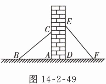 3. 如图 14 - 2 - 49,有两个长度相同的滑梯靠在一面墙上。已知左边滑梯的高度$AC与右边滑梯的水平长度DF$相等,那么判定$\triangle ABC与\triangle DEF$全等的依据是( )