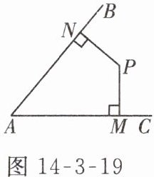 5. 如图 14 - 3 - 19,$ PM \perp AC $ 于点 $ M $,$ PN \perp AB $ 于点 $ N $,$ PM = 2 $,当 $ PN = $______ 时,点 $ P $ 在 $ \angle BAC $ 的平分线上。